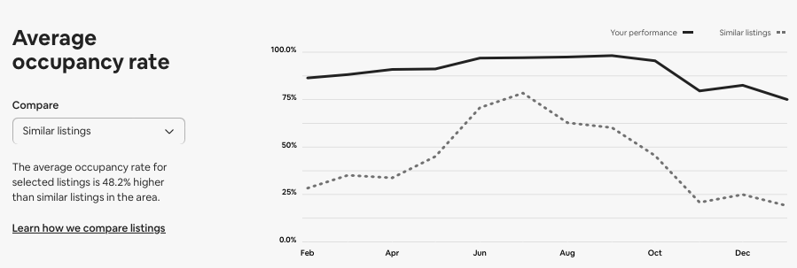 Here is a screen grab of occupancy data from AirBnB in 2022, arguably the very best year in the history of the short term rental industry. We crushed the competition in occupancy and total revenue. See below — our homes are represented in the solid line; the market is in the dotted line.