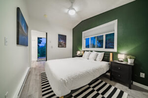 The owners, who live in the attached home, wanted ot create an inviting space that makes you feel like you’re high up in the air. They are avid rock climbers, after all! The massive second-floor picture windows offer commanding views over our neighborhood to the mountains of Lumpy Ridge and the twinkly lights of the Stanley Hotel.