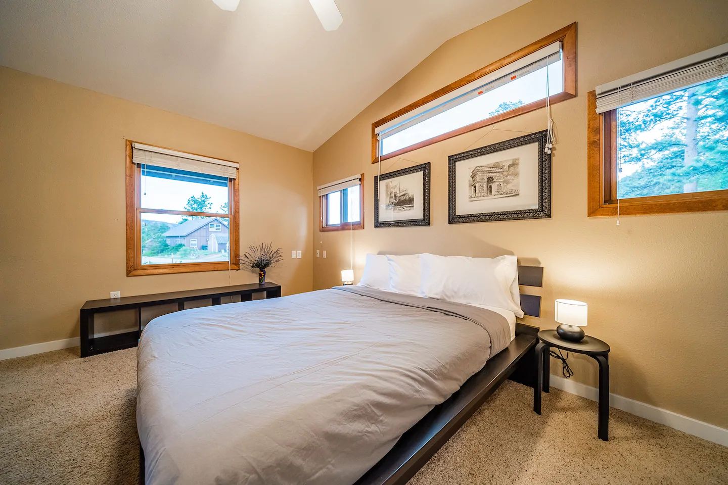 - A queen bedroom on the west side, with views from the bed of the mountains. If you want to wake up to the morning light, you’ll see the sky come alive as the light first hits Lumpy Ridge