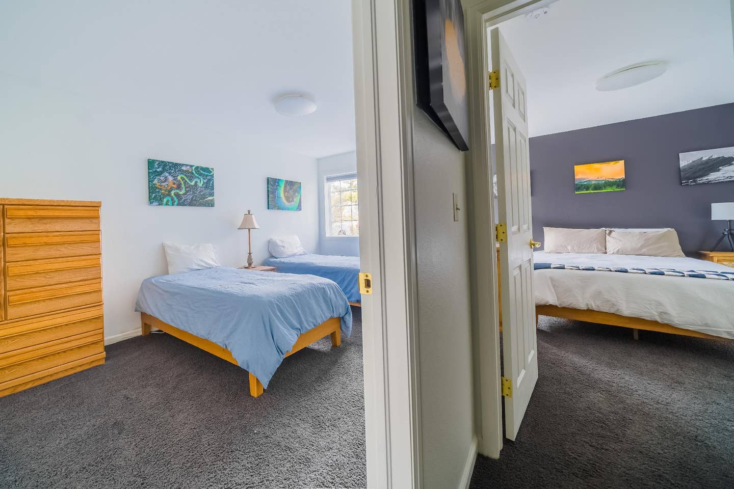 The open floor plan leads to a modern kitchen that’s fully equipped so you can cook your own meals. You’ll have your own fridge, oven, and pots/pans/plates/dishes. Attached to the living room is a large master bedroom suite with huge king size bed, lots of closet space and a great bathroom. Adjacent to the kitchen is a second full sized bathroom, a cozy and very quiet bedroom with a queen bed, and a third bedroom with two twin beds. You’ll also have access to a washer/dryer in a closet next to the second bathroom. The living room couch turns into a sofa bed, enabling sleeping for up to 8 (2 in a king bedroom, 2 in a queen bedroom, two in the bedroom with two smaller beds, and two on couch).