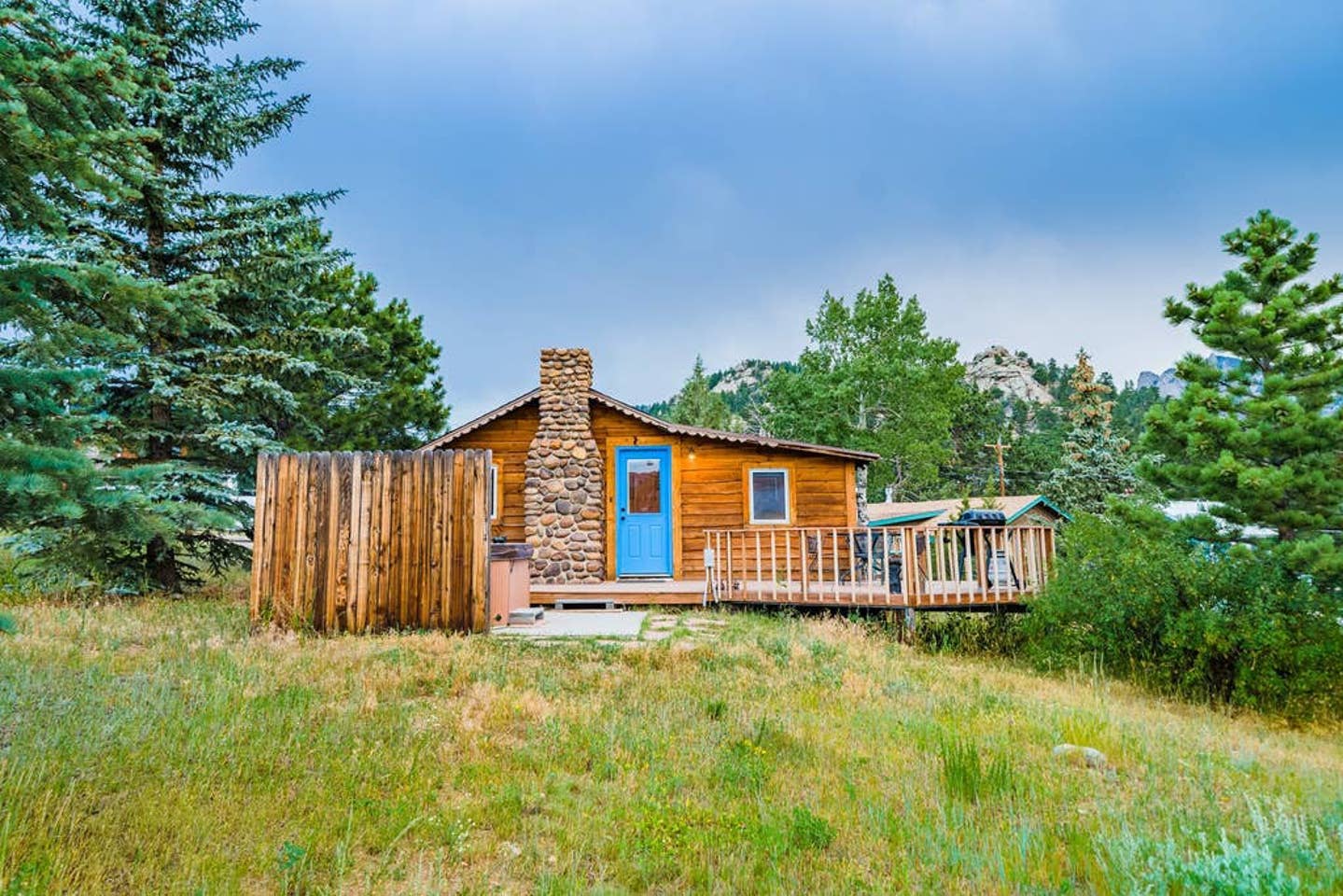 A small deck with a grill off the front door overlooks Lumpy Ridge, a perfect spot for a BBQ. The hot tub fits two comfortably but you could squeeze more in if necessary. It has a small fence around it for privacy from the neighors’ cabins, but the northern side is open so you can watch the mountains.