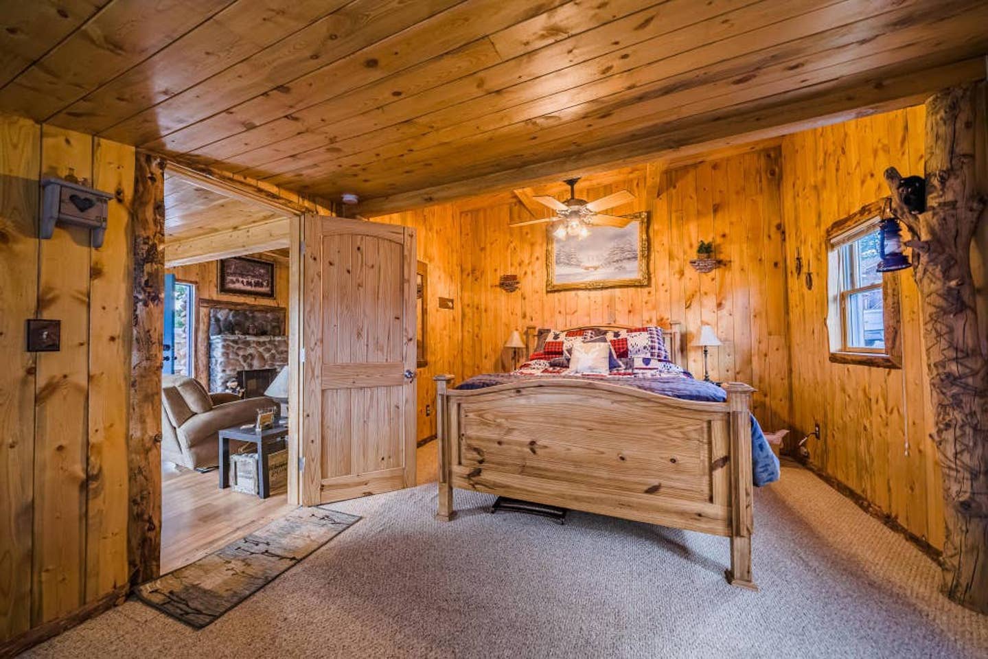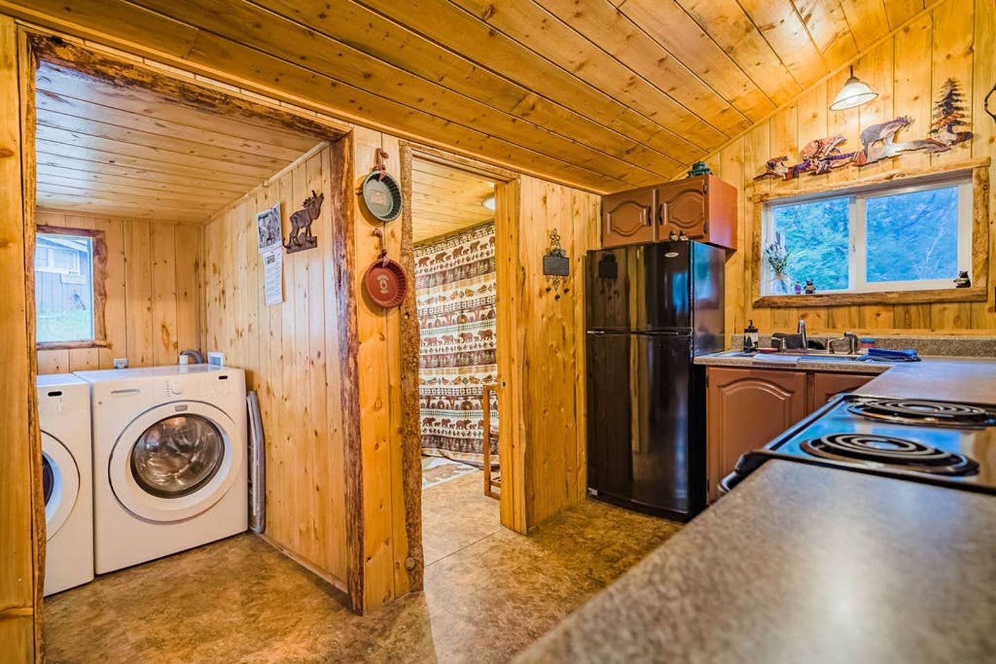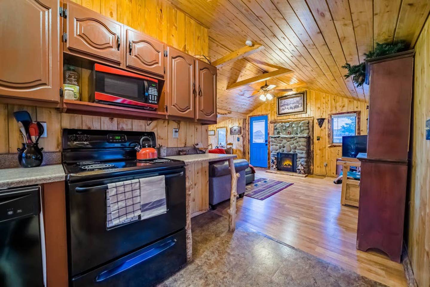 There’s a spacious dining room table and a comfy couch to lounge in while you stream your favorite Netflix series on the speedy WiFi. Feel free to fire up the fireplace — it’s electric but offers a great ambiance as the flames flicker on the cozy wood walls.