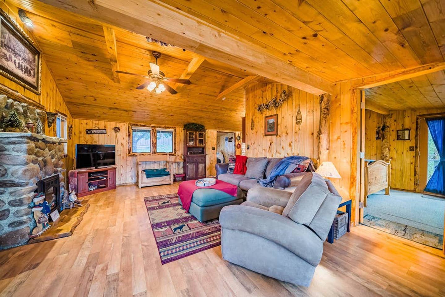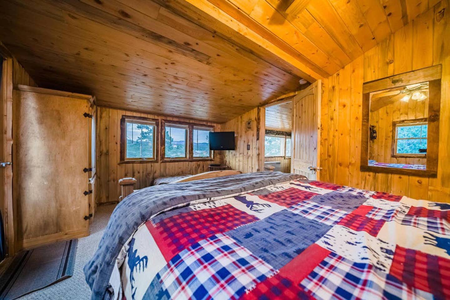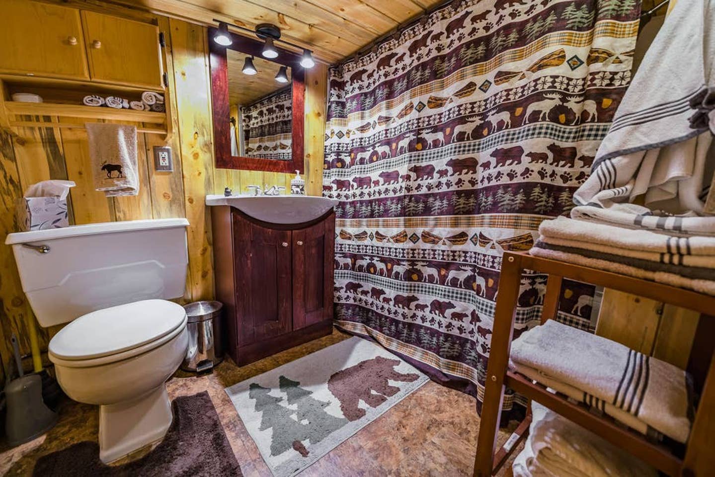 There’s a spacious dining room table and a comfy couch to lounge in while you stream your favorite Netflix series on the speedy WiFi. Feel free to fire up the fireplace — it’s electric but offers a great ambiance as the flames flicker on the cozy wood walls.