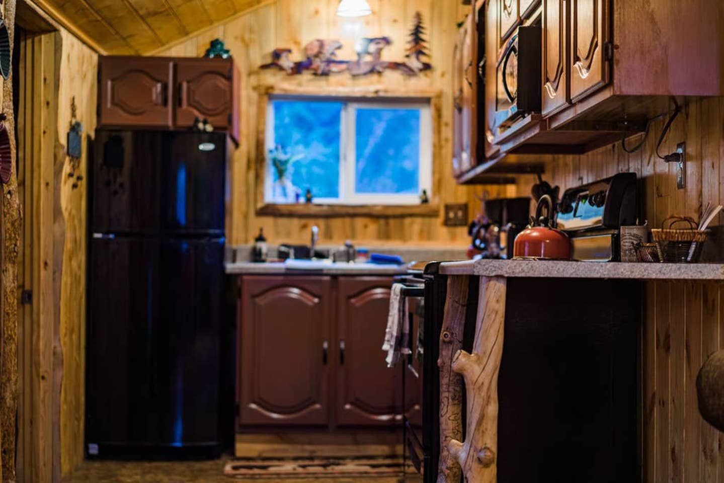 There are other cabins close by, so if you are looking for total seclusion this isn’t your best bet — but there aren’t many vacation rentals out there offering the great combination of views, a hot tub, fireplace, deck, full kitchen, and the ability to walk to town.