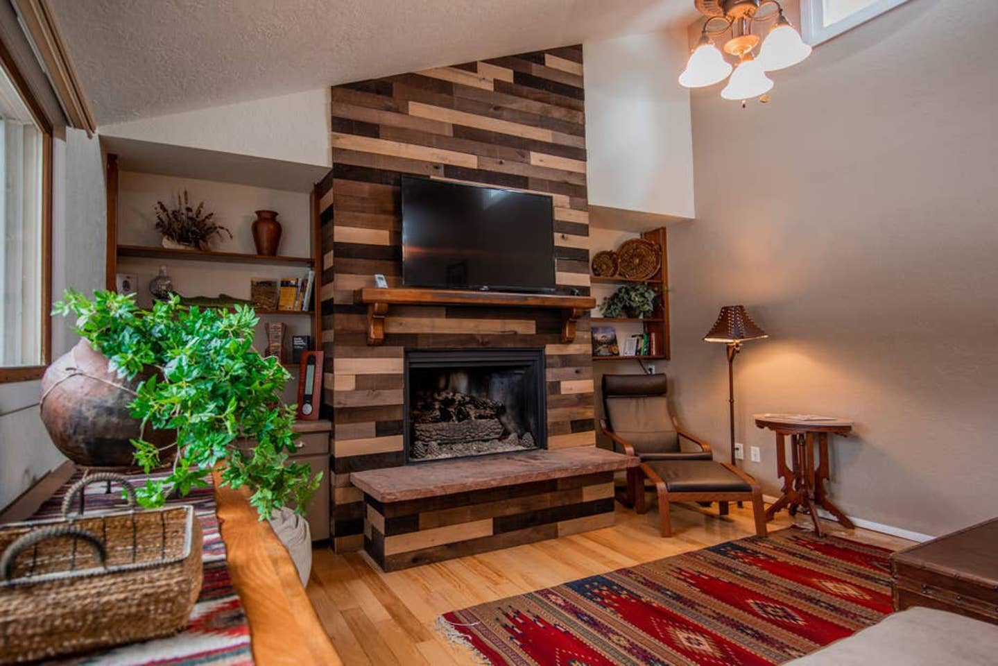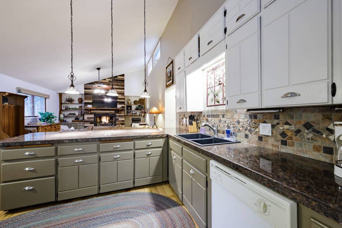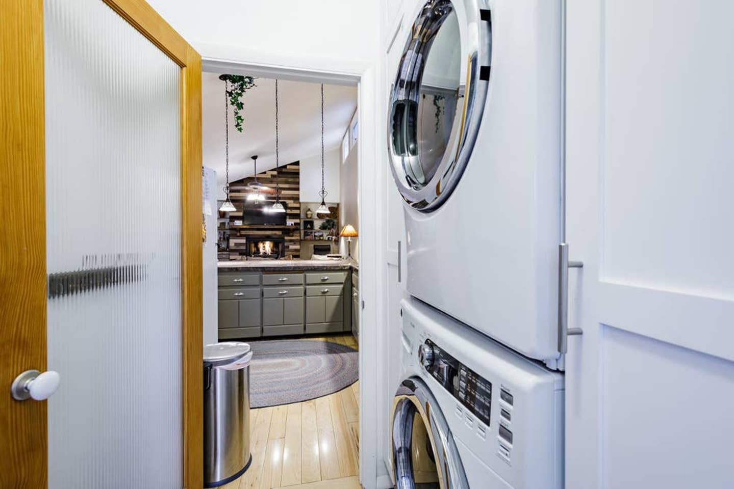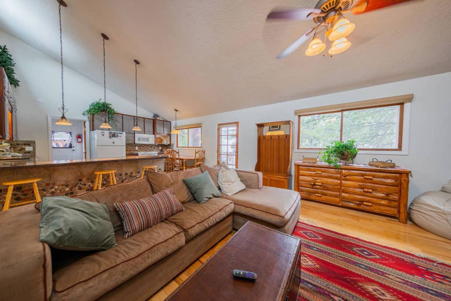 The kitchen is fully equipped with a blender, coffee maker, fridge/freezer, pots and pans, cutlery, silverware, baking supplies, and all the gadgets and utensils you can imagine. There’s a great breakfast bar and a kitchen table. The open living space also features a huge couch you can sink into, as well as additional seating, all centered around a cozy gas fireplace.